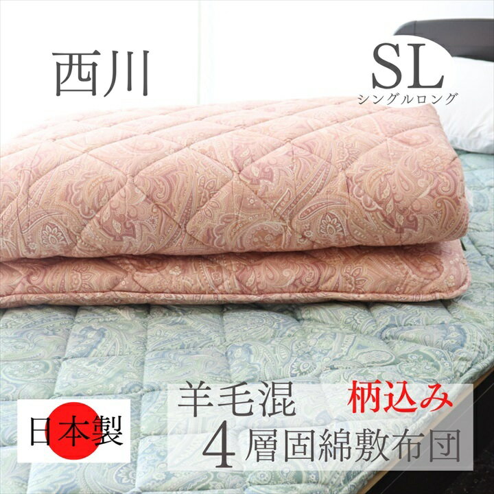 商品情報メーカー昭和西川サイズ100cm×210cm(シングルロング) キルティング加工商品側地綿100%詰め物上層:ウール50%ポリエステル50%(0.5kg)中層:ポリエステル100%(固わた)(1.5kg+1.5kg)下層:ウール50%ポ...