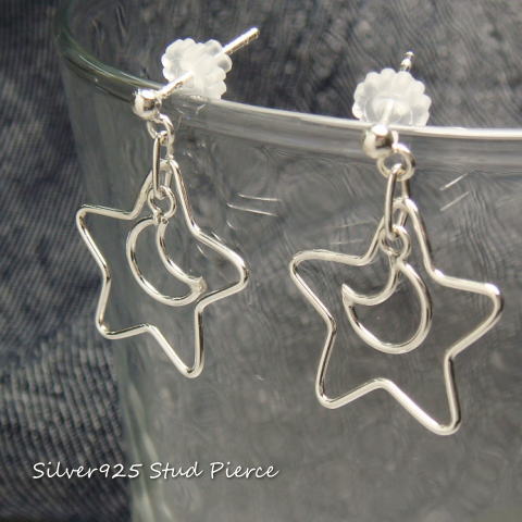 シルバーピアス お星様の中でお月さまが輝く スター&ムーンのサガリピアス f083(f-7-5) シルバー925 si...